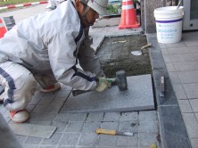 公衆トイレ出入口の段差を無くす修理を行ってます。