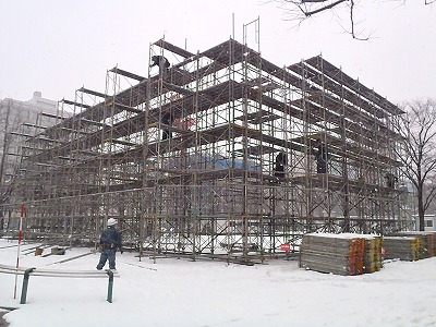 雪像の準備 2010年12月23日 西10丁目です。 雪像の準備が始まりました。足場を組んでコンパネで枠を作り、それから雪を搬入します。 雪の搬入が終われば、雪像作り開始です。 今年の雪まつりは、2月7日から2月13日までです。昨年とは、若干日程が変更になっております。