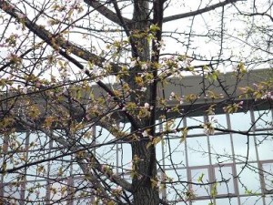 エゾヤマザクラがようやく咲き始めました。写真は6丁目南側の木です。