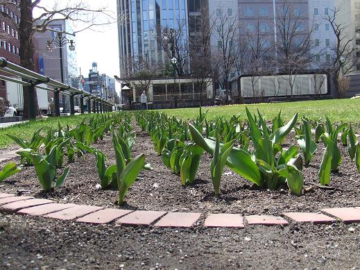 5丁目東側のチューリップ花壇。まだ小さいですが、順調に育っています。