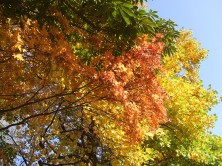(写真:西7丁目北側~上部緑色・・・トチノキ、 真中赤色・・・ヤマモミジ、 右奥黄色・・・ユリノキ)