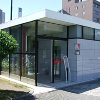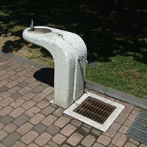 中央ドームは、地下鉄の換気施設を兼ねている。上部より、石組みの壁を伝わって滝のように流れ落ちる。噴水池直径15.0m