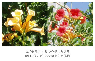 璧泉の両脇に咲いている、明るいオレンジの花が大きく開き、中がクリーム色をしているのがノウゼンカズラ、花筒が細長く、黄色の花が咲いているのが黄花のアメリカノウゼンカズラです。もう一種、花筒の中まで真っ赤でやや開いた花を咲かせているのは、この両者の交配から生まれた‘マダムガレン’という品種によく似ていますが、正確なことは分かりません。
