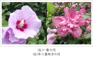 ムクゲには、白から淡い紫、赤、濃い紫などの花色や、普通の一重咲きだけでなく、半八重から重弁の八重咲きまで様々な花型があります。品種名がよく分からないものの、簡単に増やすことができるせいか、市内でもたくさんの種類が栽培されています。