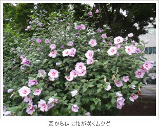 ハイビスカスの仲間では最も耐寒性が強く、道内でも平気で越冬できますが、この仲間の花はほとんどが一日花であるように、本種も一日からせいぜい数日でぽとりと花が落ちてしまいます。これも当年枝開花性の性質があり、勢いのよい枝を伸ばさせるとたくさんの花芽をつけることから、秋に強めに切り詰めておくと翌年たくさんの花を咲かせることができます。このため、一つの花は短命でも、次々とたくさんの花が咲いてくるので、夏から秋までの長い期間美しい花を楽しむことができるのです。