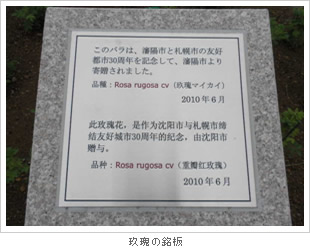 大通西12丁目のバラ園が改修されましたが、それに合わせて東側の一角に瀋陽友好コーナーが設けられました。本市の友好都市はバラがシンボルになっているところが多く、バラ園のバラもそれに因んで植え替えることにしたのです。ポートランドのあるアメリカの品種が北側に、ミュンヘンのあるドイツのバラが南側にまとめて植えられ、そして赤いバラがシンボルの瀋陽のコーナーには、瀋陽市から寄贈を受けた‘玖瑰(まいかい)’が植えられました。
