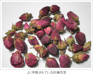 中国では、このつぼみを乾燥させたものをお茶として楽しむため、「玖瑰花(メィグィファ)」の名前でよく売られています。ほんのりと甘みがあり、淡い香りのするハーブティーで、利尿作用・肌荒れ・便秘・二日酔い・のどの痛みなどに効果があるとされています。