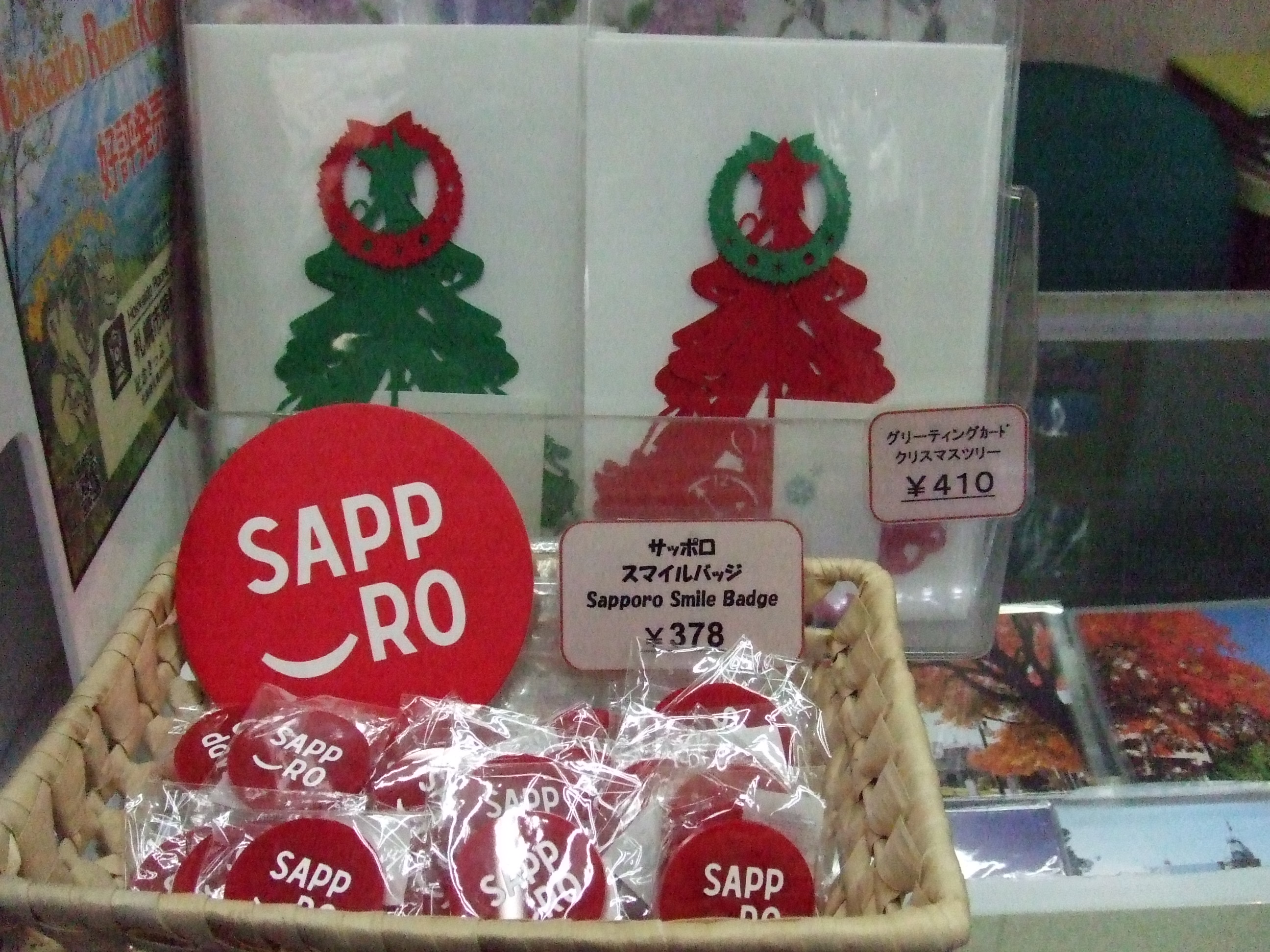 右の写真はオフィシャルショップで販売しているクリスマスのツリーの立体形のグリーティングカードとサッポロスマイルバッジです。この季節大切な方へのご挨拶に送ってみてはいかがでしょうか?