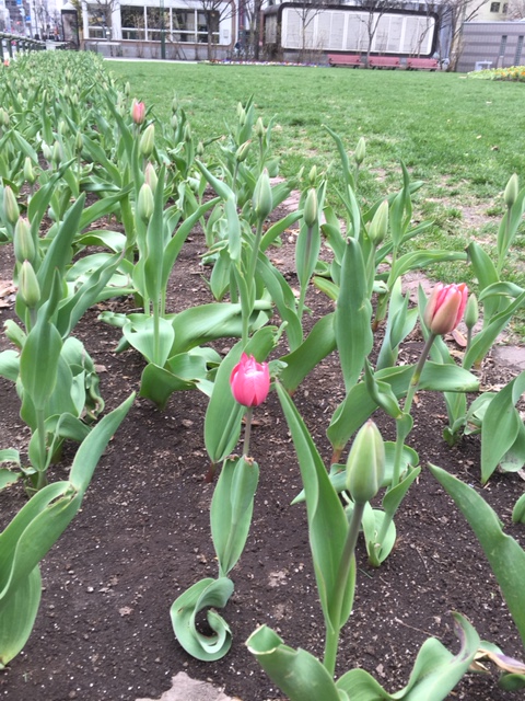 チューリップが咲きました 2018年4月26日 公園内のお花がこの陽気で咲き始めています。写真は5丁目のピンクのチューリップが何輪か咲き始めているものです。 公園内のムラサキのライラックの花芽もはっきりとムラサキ色に変わっているのがわかりますね。 4丁目の北西のユキヤナギも何輪か咲き始めています。 公園内で色々な種類の花木が開花し始めていて桜も7丁目、6丁目などではもう既に5分咲きくらいまで進んでいるものもあります。 ちなみに写真は4月25日水曜日に撮影したものです。