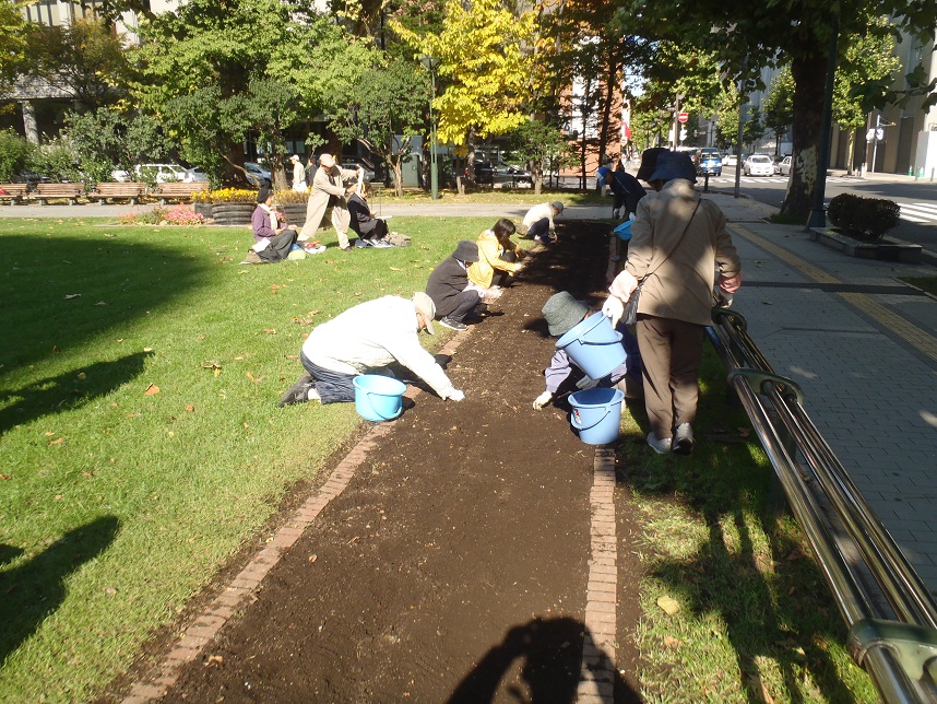 花壇ボランティアの方々による球根植え込みの風景
