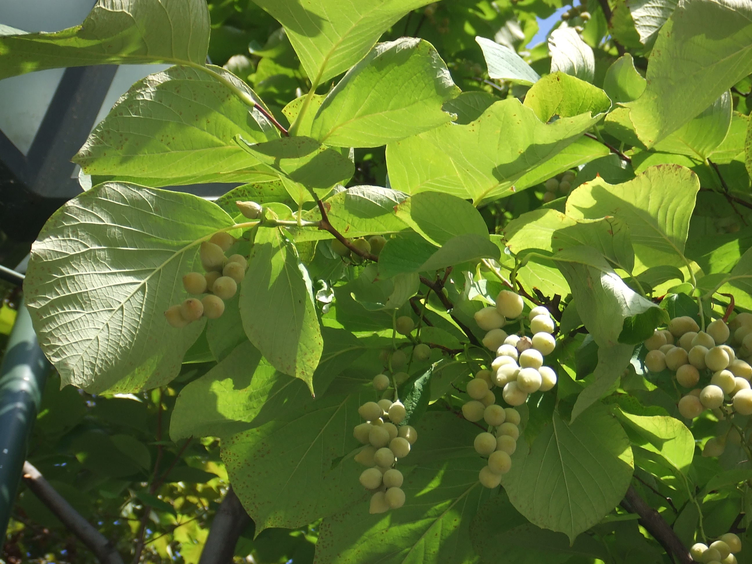 西5丁目北東に初夏には白い花を付けていたハクウンボクが薄緑の実をぶとうの房のように付けていました。