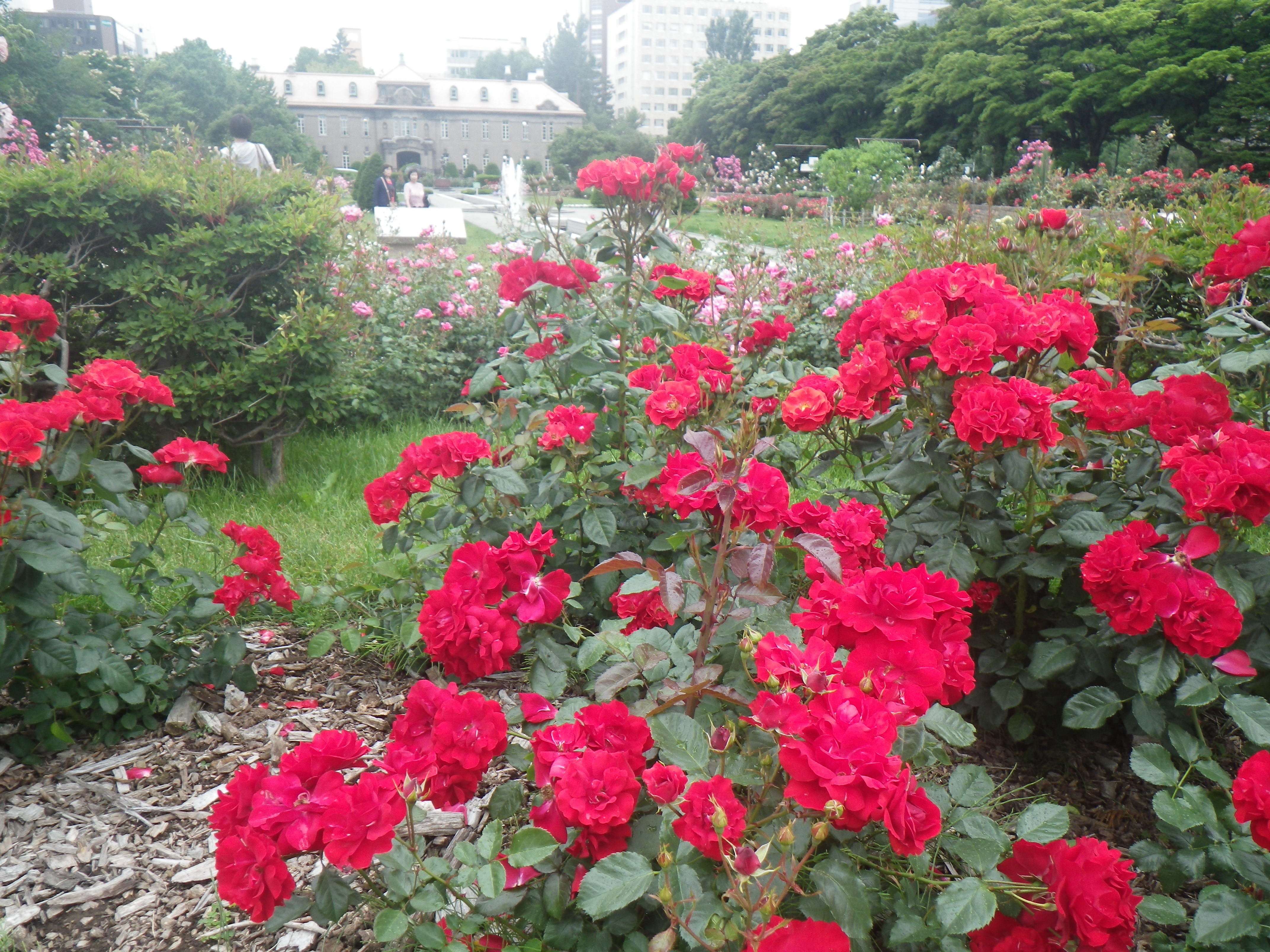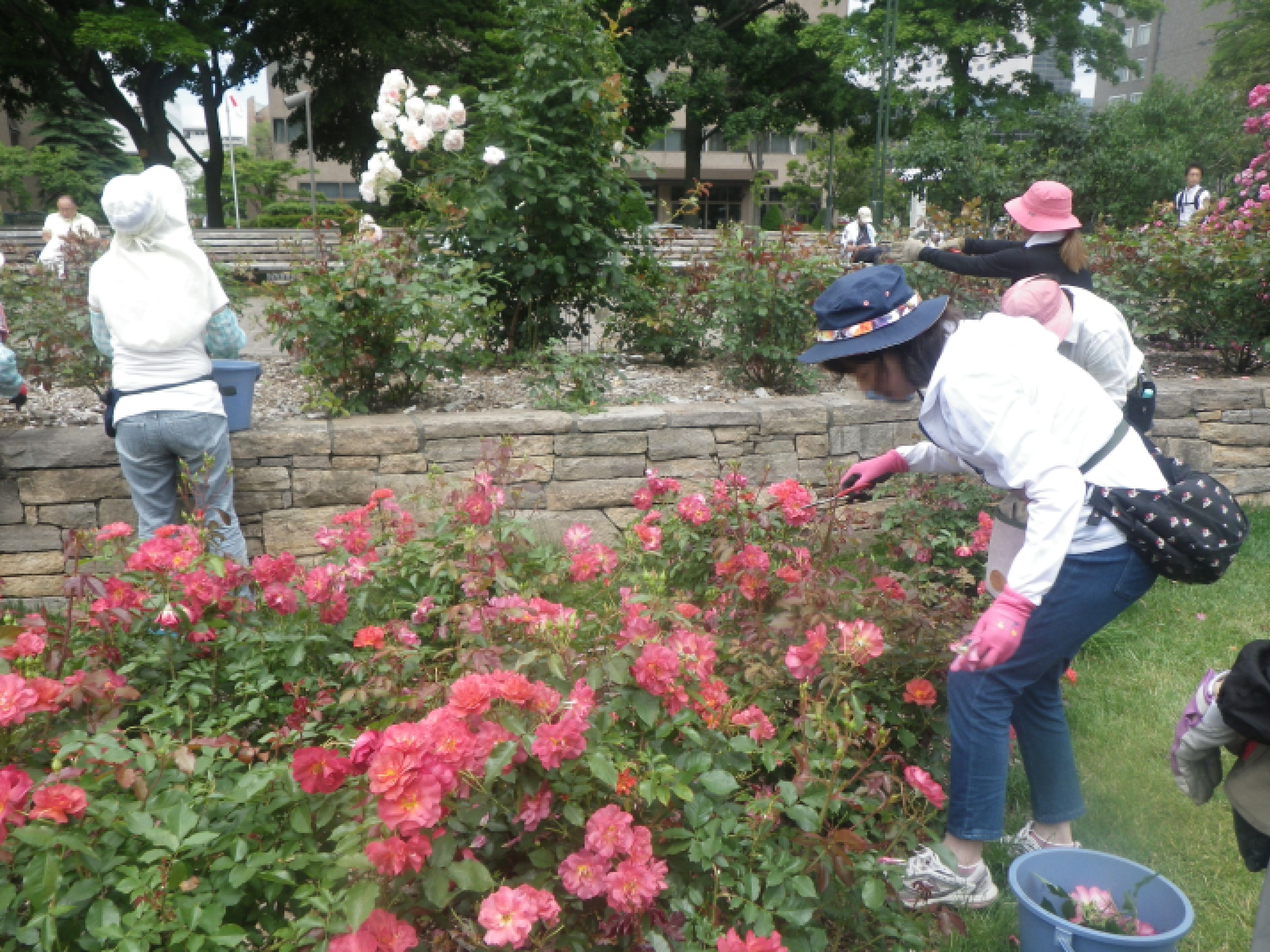 バラボランティアとバラの様子 2017年7月6日 7月5日(水)大通公園バラボランティアのメンバーにより花柄摘み等の作業をして頂きました。皆さまの活動により12丁目のバラがいつもきれいに保たれています、暑い中本当にありがとうございました。 ピンク色のバラも今見頃を迎えています。大通公園にいらした際はぜひお足をお運びください。