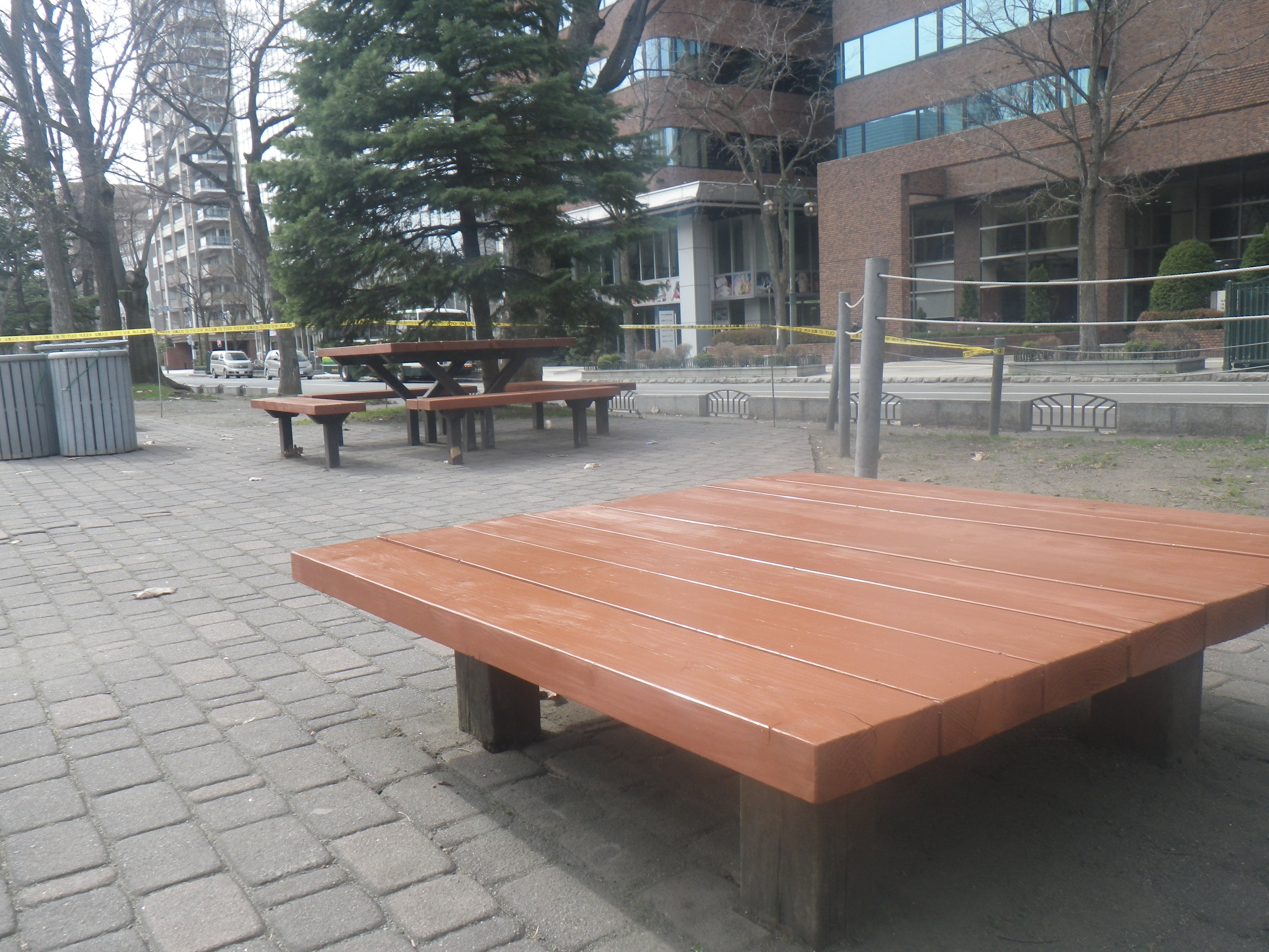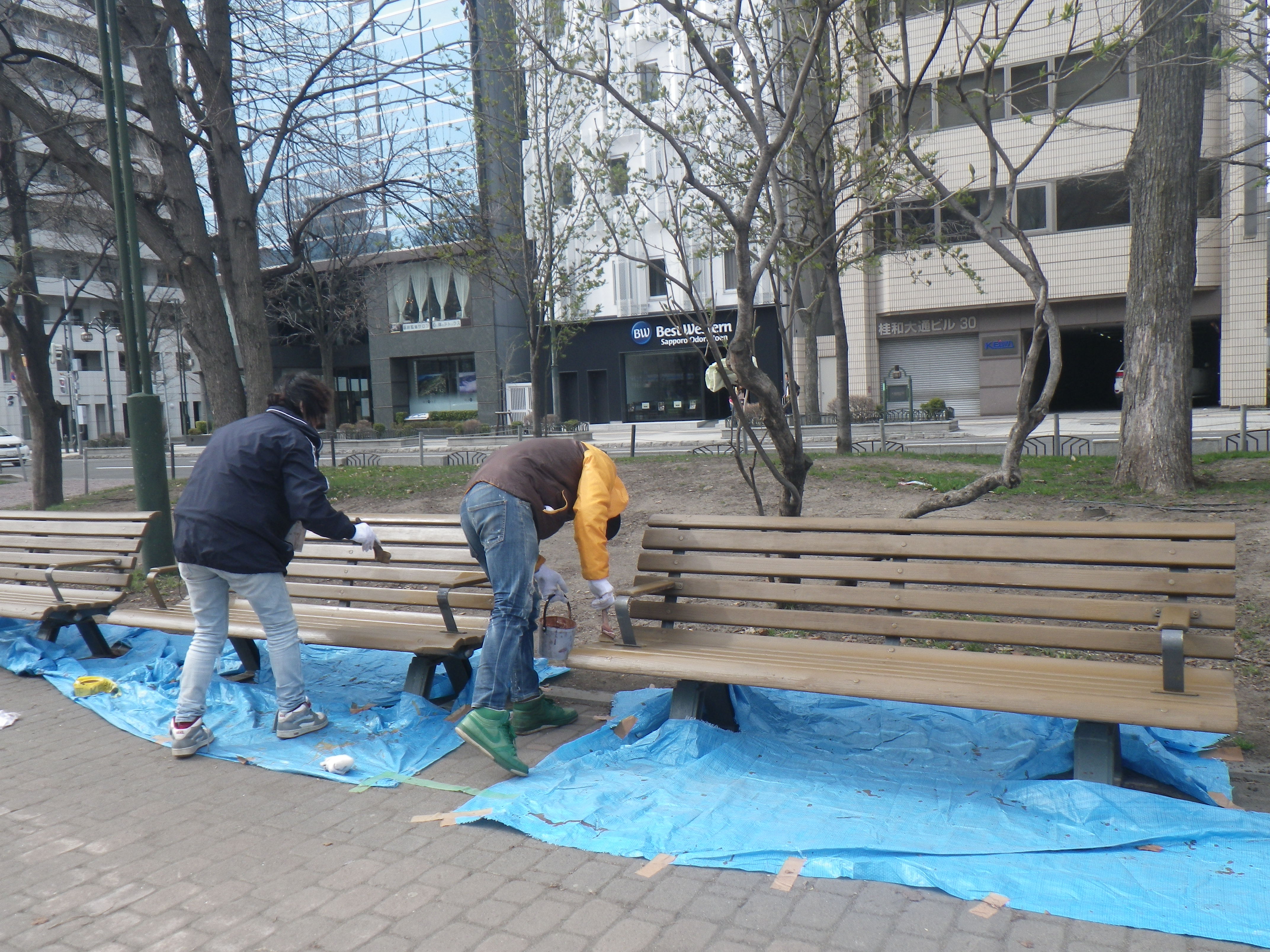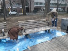 ベンチのペンキ塗り替え 2018年4月22日 4月22日日曜日西8丁目と西9丁目のベンチが札幌の景観色をつかったペンキでお色直しをしました。 西8丁目の色は団栗で西9丁目は蝦夷鹿というぺんきの色で塗り替えられました。 とても明るくきれいに仕上がりました。こどもたちがよく遊ぶところなのでたくさんの方が使ってくれることでしょう。 こちらはサッポロウッドリペインターズと市民のボランティアの皆さまが協力して塗り替えていただきました、本当にありがとうございました。 お天気にも恵まれとても順調に作業が進んだようです。