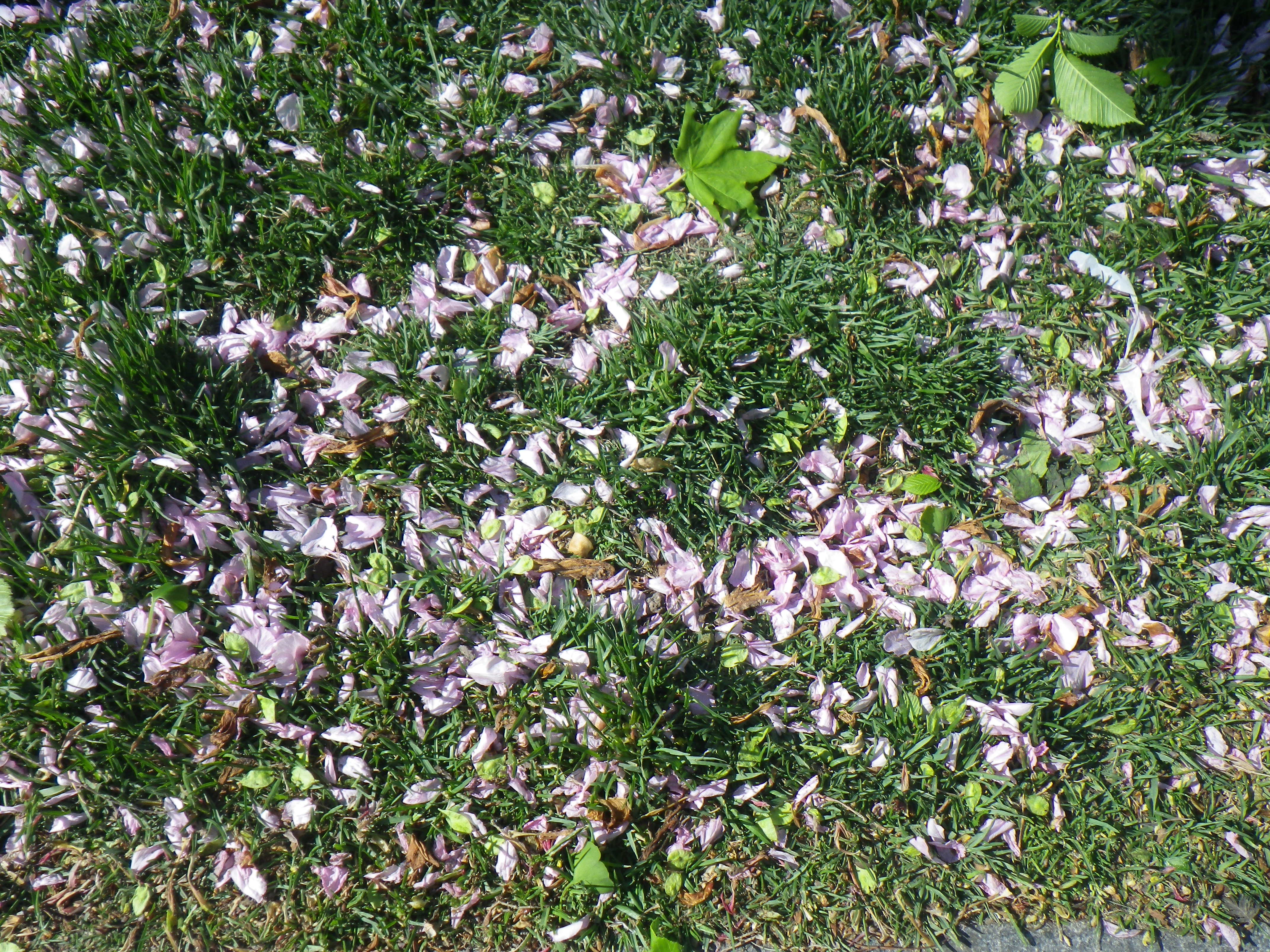 サトザクラの花びらが強雨でたくさん散ってしまいました。花びらが舞っている風景はきれいなのですが、少し寂しいような気もします。