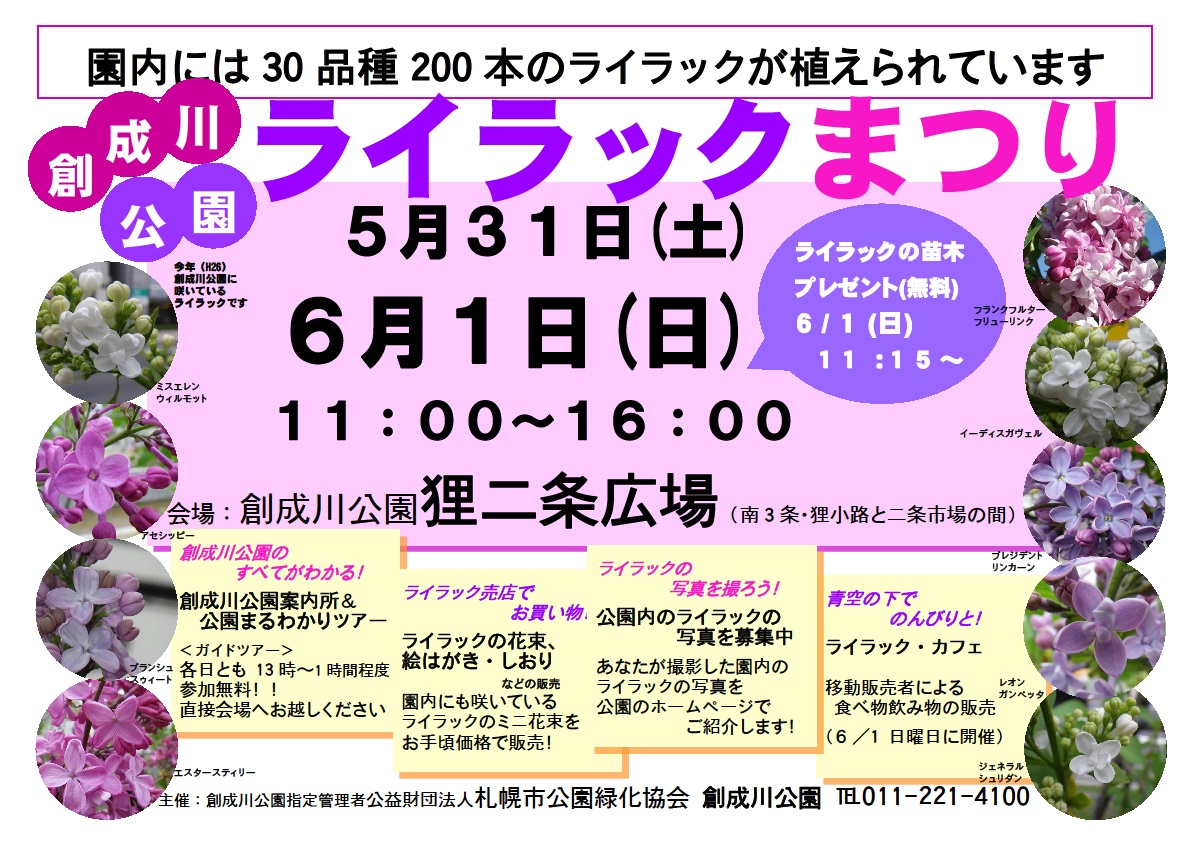 お隣「創成川公園」では、6月1日をメインに、5/31(土)・6/1(日)の2日間、「創成川公園ライラックまつり」を開催します。