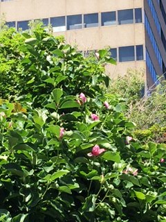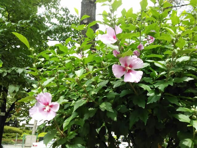 本日より、市内の小中学校も夏休みに入り園内もお客様で賑わっております。園内では早くもムクゲの花が咲き始めました。日当たりの良い場所から次々咲き始めているようです。