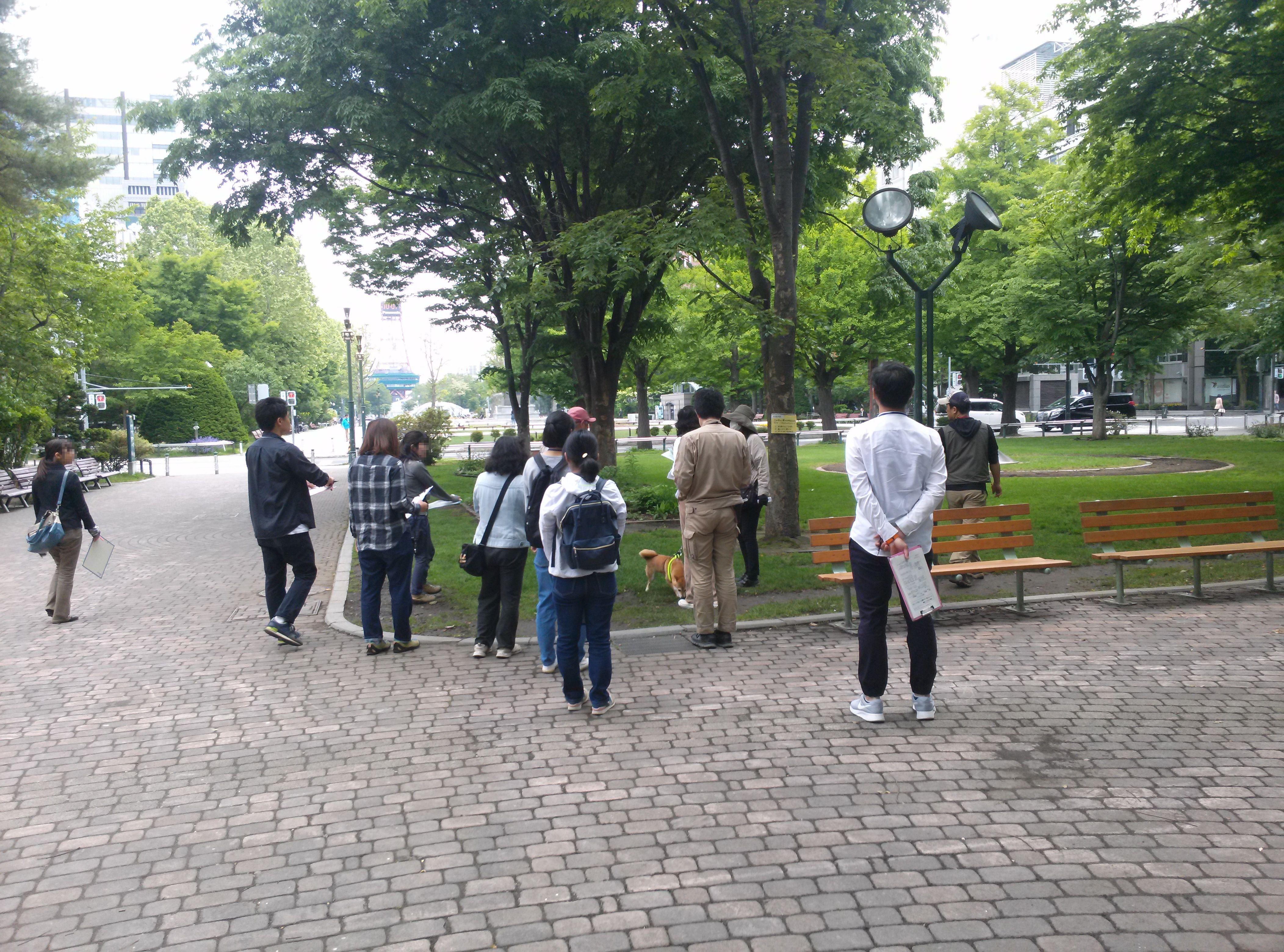 大通プレミアムウィークエンド! 2017年6月17日 久しぶりに気持ち良く晴れた週末です。今日と明日は、大通公園の魅力にせまる2日間。初日のクイズで楽しむ公園のマップづくり講座の様子です。明日は、本日作成した公園マップを持って大通公園を探検する大通deオリエンテーリング(事前申込み不要10:00~16:00)開催します。チェックポイントを回って大通公園を知り尽くすプログラムです。マップは、本部(6丁目ステージ)にて配布しております。 皆さま、この機会に素顔の大通公園を存分にお楽しみください。ご参加、お待ちしています! マップ作り講座についての説明 公園内散策