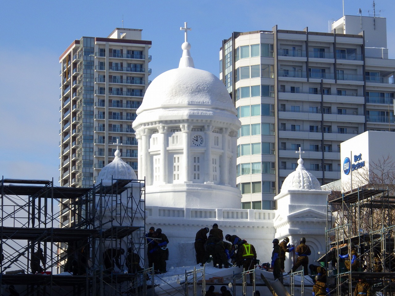 西7丁目のヘルシンキ大聖堂の雪像づくりの様子