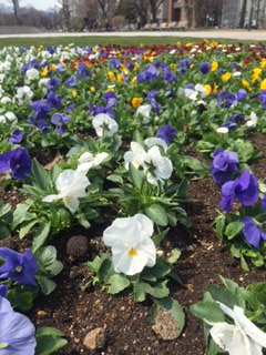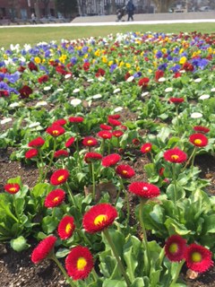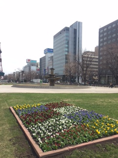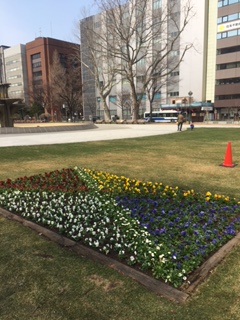 春花壇がきれいです 2016年4月16日 大通公園では、4月14(木)15(金)の2日間で恒例の春花壇が造成されました。昨日の強風もおさまり穏やかな土曜日になりましたので、のんびりとお花を見たり写真を撮ったりと道行く人たちの目を楽しませています。こちらは、4丁目花壇です。 どの花壇も、デザインに趣向を凝らし美しく仕上がっています。色とりどりのパンジーやデージーが元気に咲いています。デザインを見ながら園内をお散歩するのもおすすめですよ。