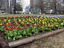 今週は、19日と20日の2日間で「札幌市花壇推進組合」の方による春花壇の造成が始まり、公園内も一気に春めいてきました。  どの花壇も、パンジー4色600株とデージー2色120株計720株の同じお花が植えられていますが、デザインはそれぞれ組合様におまかせしてますので、ぜひお楽しみください。