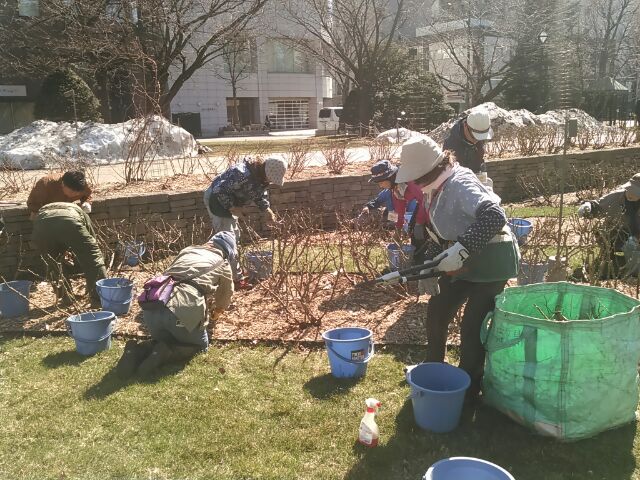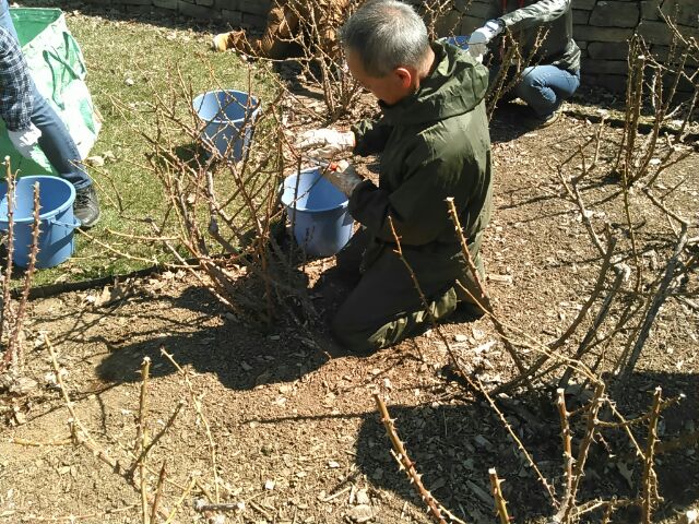 本日のバラ花壇ボランティア活動 2019年4月13日 4月13日土曜日、気温も上がり青空が広がり爽やかな日となりました。 本日も工藤敏博先生を迎えバラの剪定講習と作業を行いました。 バラの枝を1本ずつ見極めて剪定していきます。 たくさんのバラの種類があります。枝の太さや成長具合も様々です。 今はまだ枝がむき出しですがこれからどんどんと成長が進んでいきます。 みなさん、お疲れ様でした。