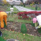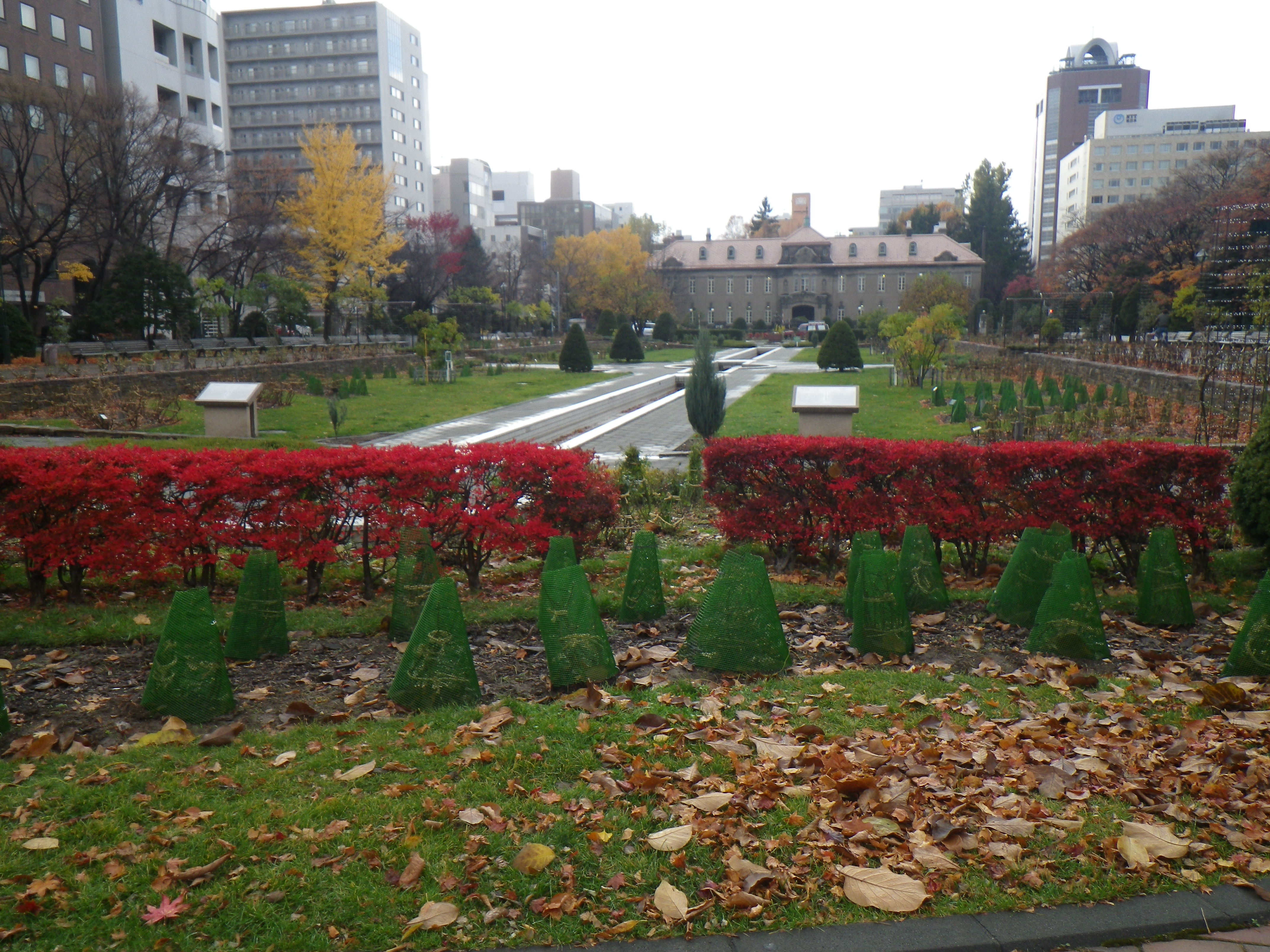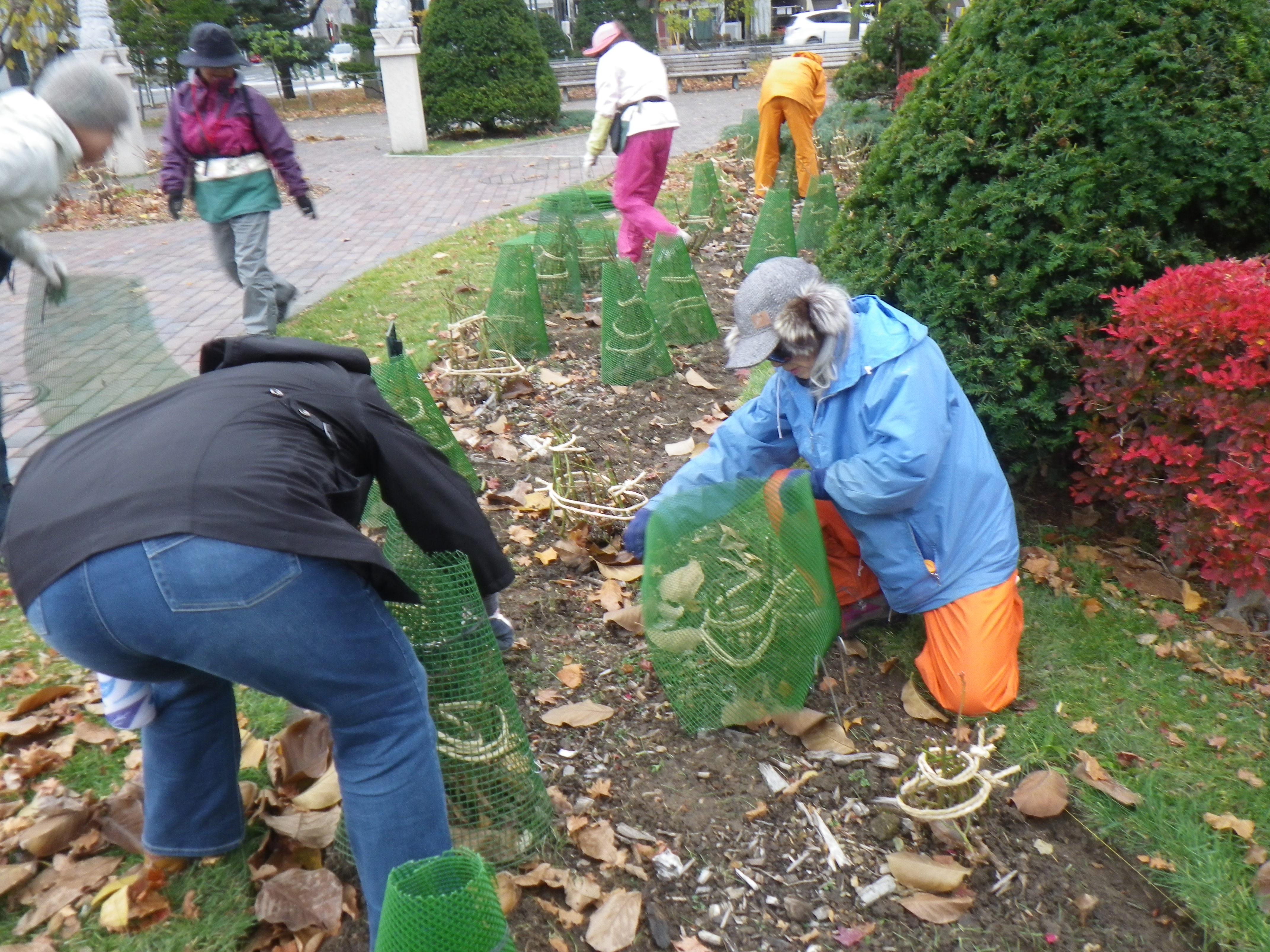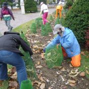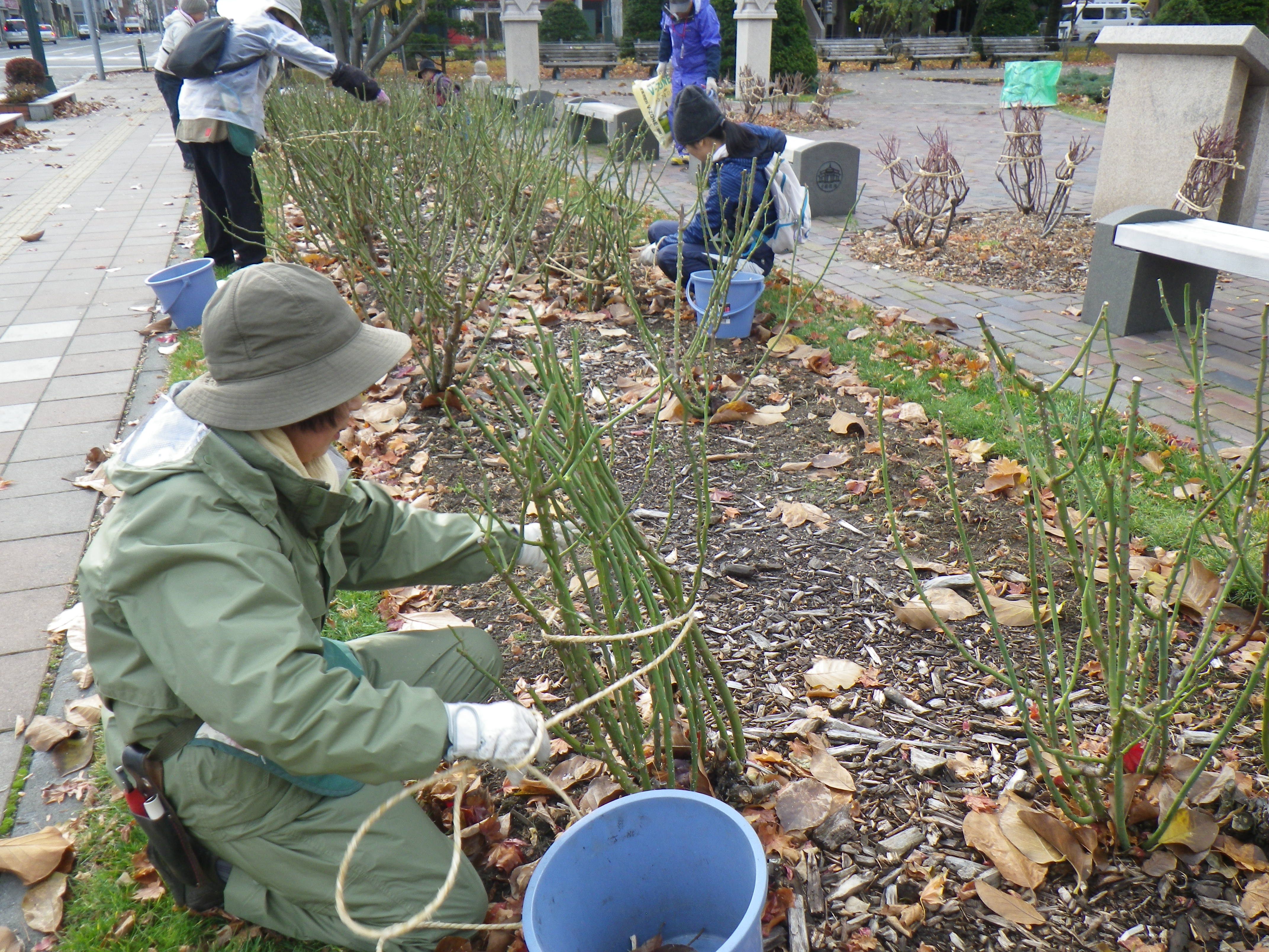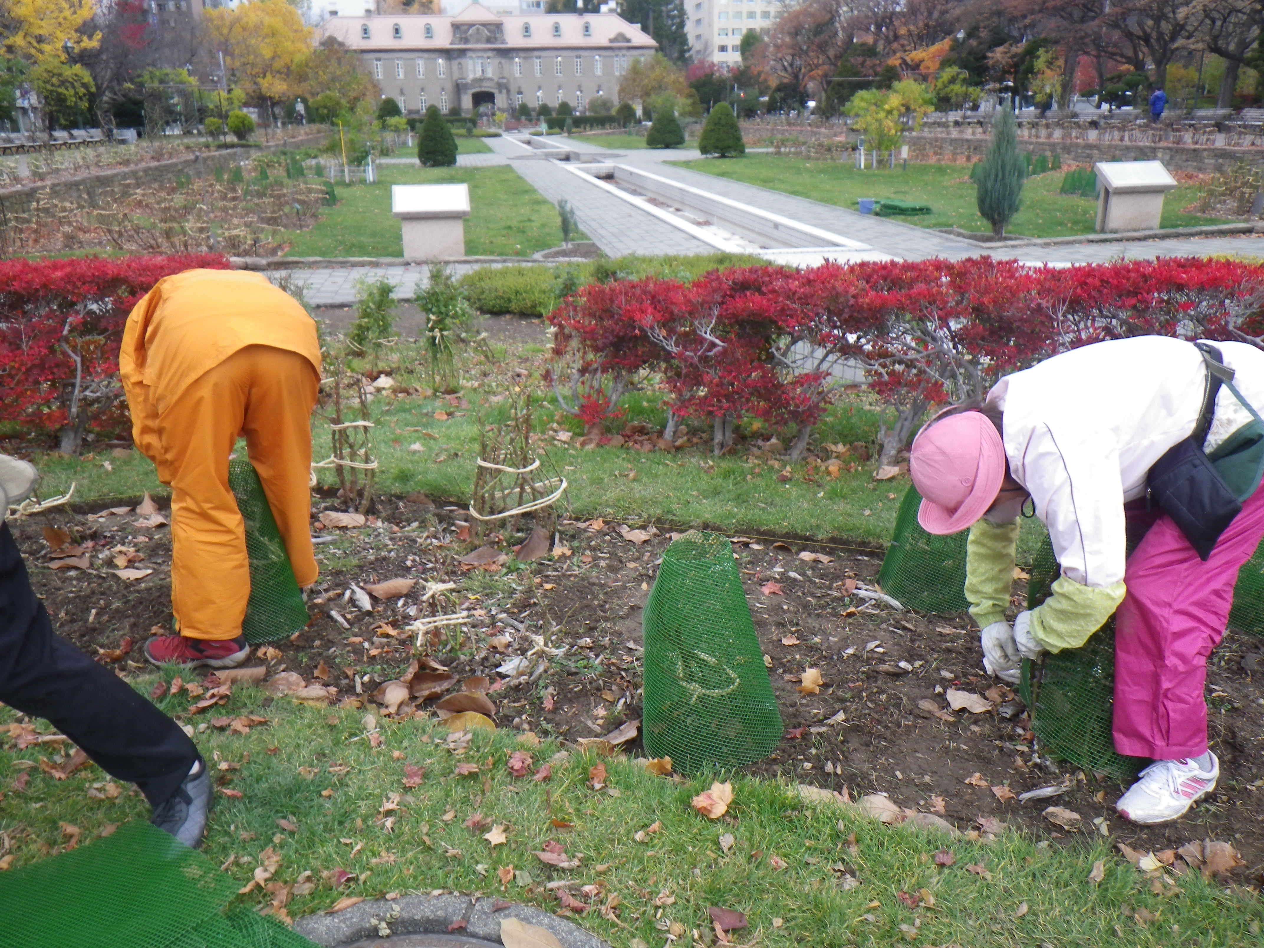 西12丁目バラ園冬支度 2017年11月4日 10月28日、11月1日、11月4日の三日間にわたり、西12丁目バラ園の管理をしている ボランティアのみなさんで冬囲いの作業をしました。 最終日の今日は天気予報の雨(雪)マークを押しやり、好天のもと無事に作業を終了しました。 (終了と同時に雨が!) 今年も春からお疲れさまでした。来年のバラも楽しみです。
