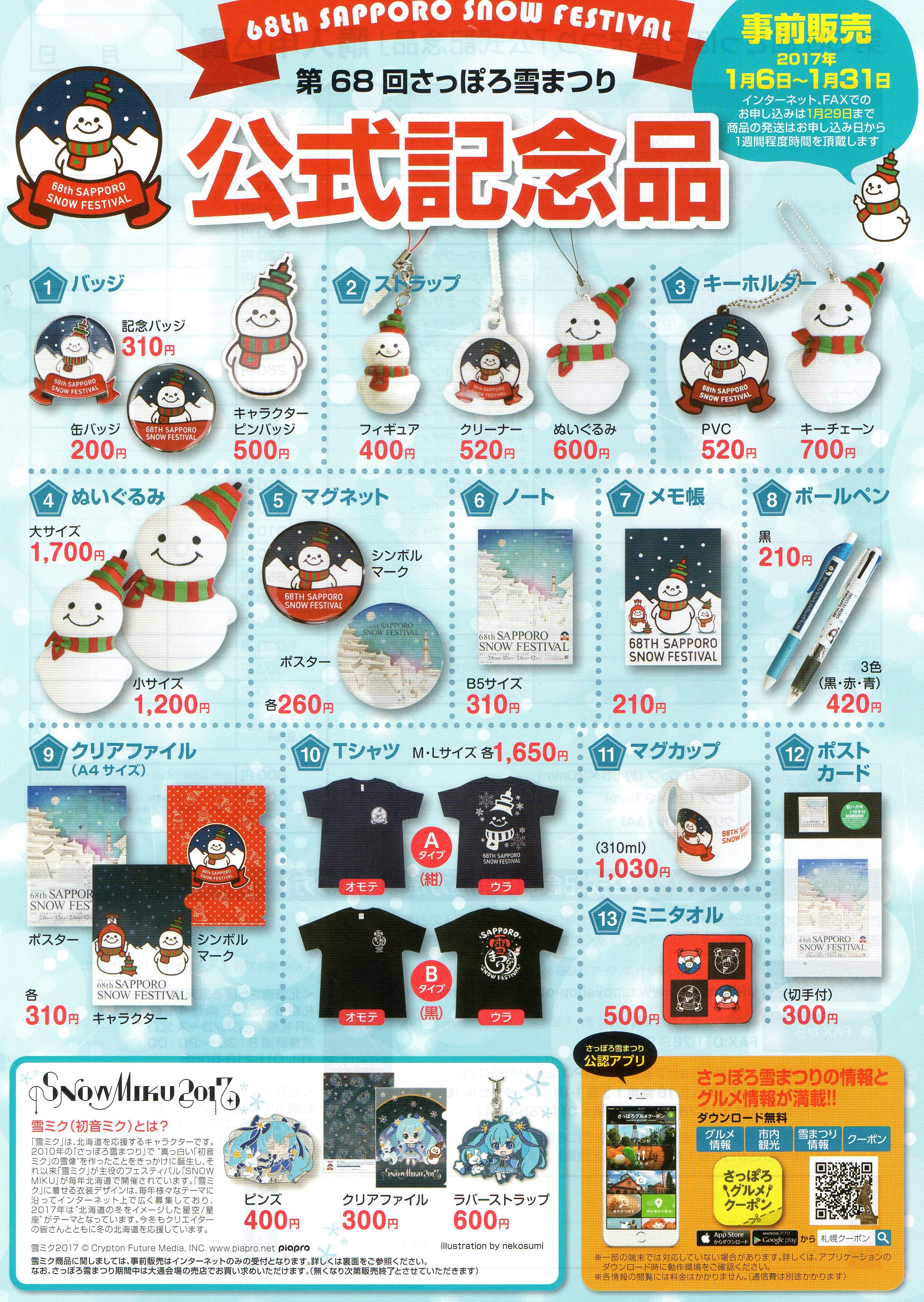 第68回さっぽろ雪まつりの公式記念品の事前販売が2017年1月6日(金)~1月31日(土)まで行われます。