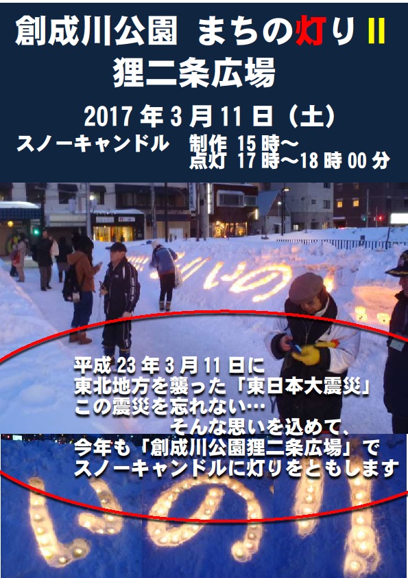 3月11日創成川公園でスノーキャンドル開催 2017年3月8日 大通公園で活動している公園ボランティアさんたちも参加して、3月11日土曜日に、創成川公園狸二条広場にてスノーキャンドルづくり・点灯のイベントが開催されます。 <創成川公園 まちの灯りⅡ> どなたでも参加できます。 スノーキャンドルづくり 15時~17時 スノーキャンドル点灯 17時~18時 狸小路と二条市場の間、狸二条広場にお集まりください。