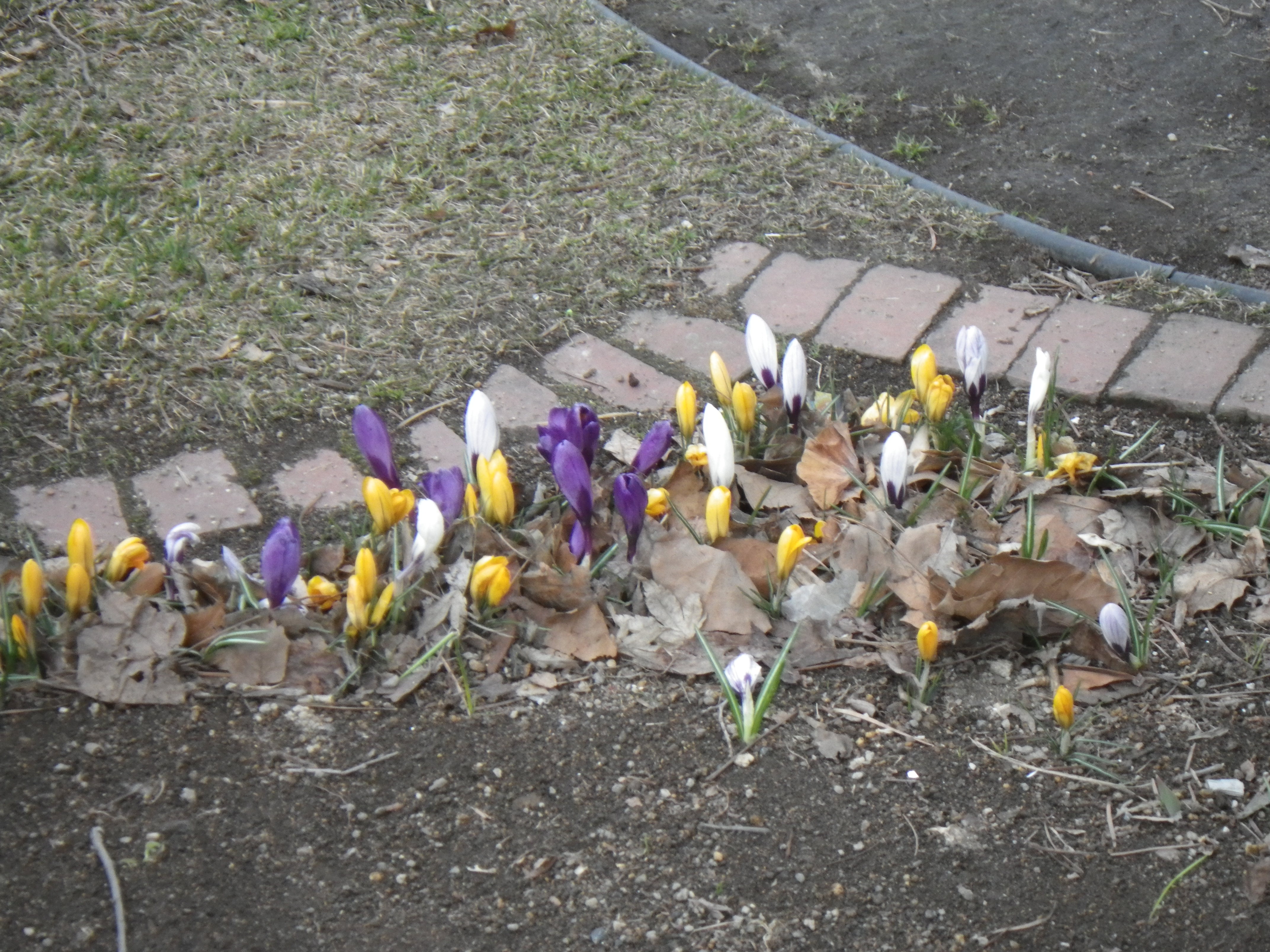 左は2丁目西ボーダー花壇のクロッカスが白、紫、黄色と色とりどりに咲いていて公園内で華をそえています。