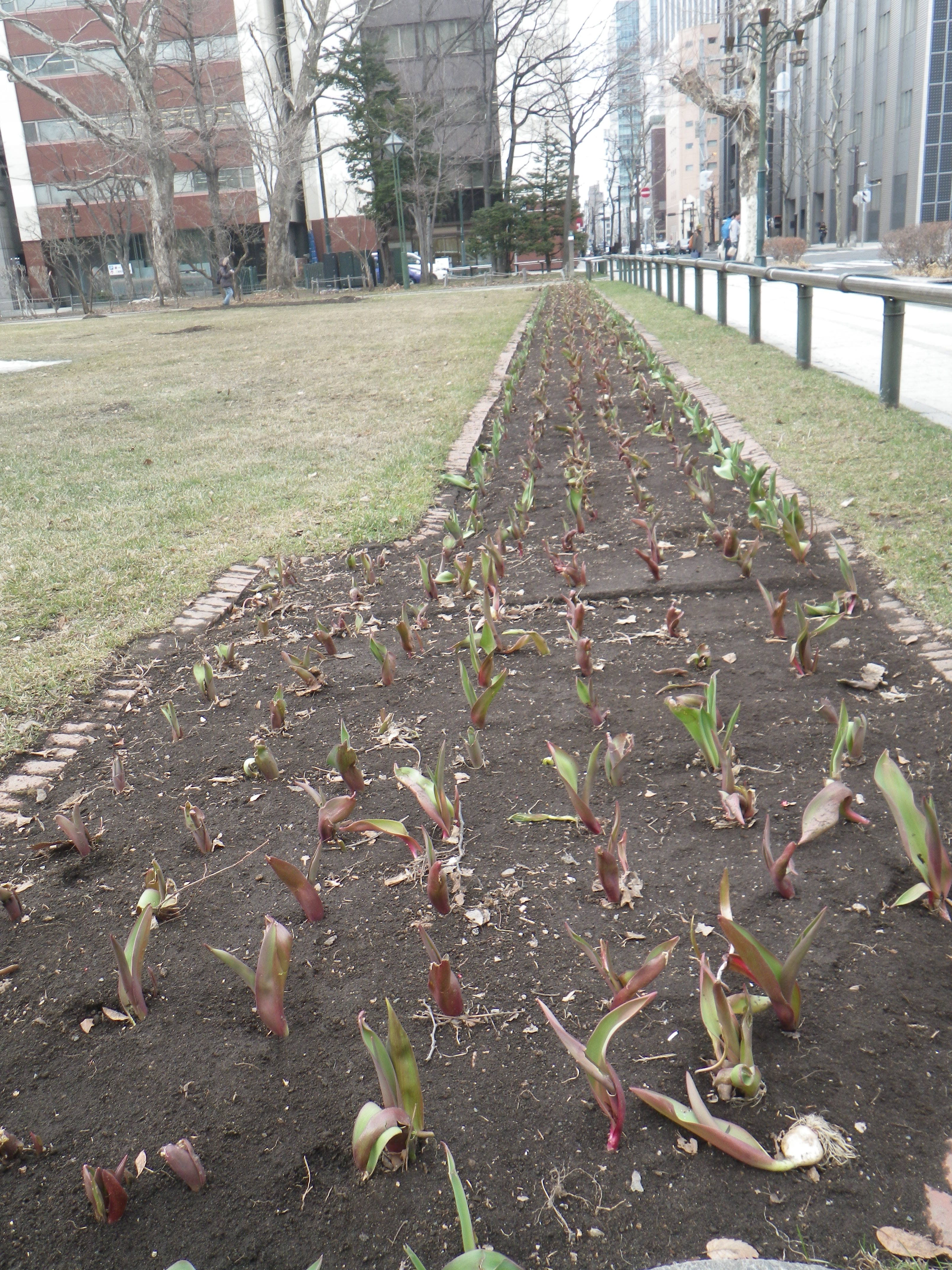 右は5丁目東のボーダー花壇のチューリップの葉っぱが茶色から緑色に変わってきていてぐんぐん伸びてきています。