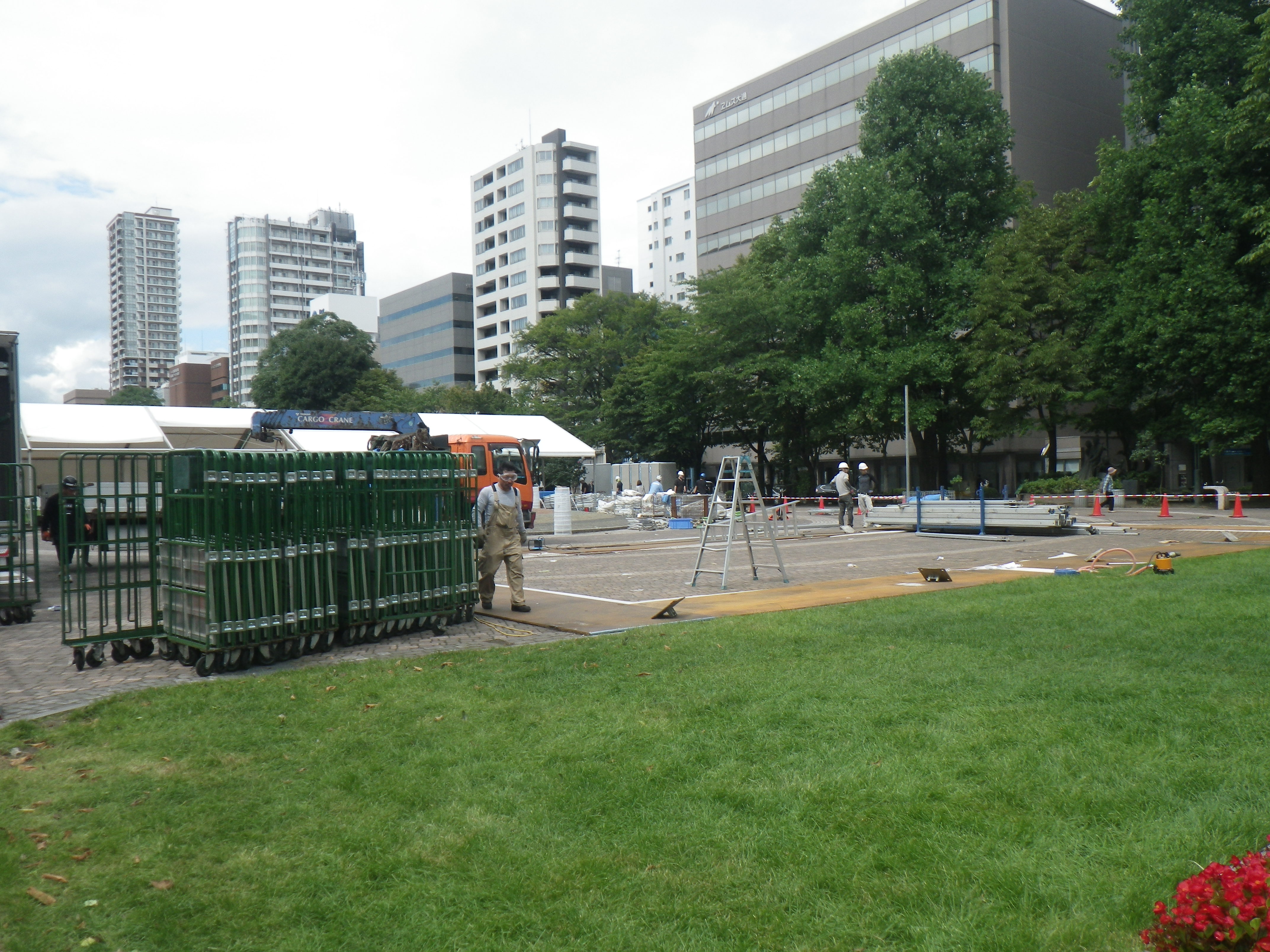 遅めの開花、7丁目のサルスベリ 2018年8月28日 北海道マラソンが終わり インフォメーションセンター&オフィシャルショップがある西7丁目では あっという間に設営された大きなテントが撤去されています。 撤去作業の様子 夏の終わりを感じつつ ふと見ると、昨年より遅めに開花したサルスベリが きれいなピンク色の花を咲かせていました。 西7丁目サルスベリ開花した様子