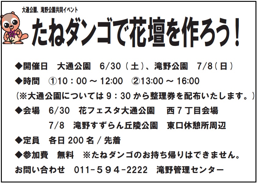 花フェスタの開催期間中の6月30日土曜日、西7丁目の西側芝生内花壇にて「たねダンゴで花壇を作ろう!」を開催します。