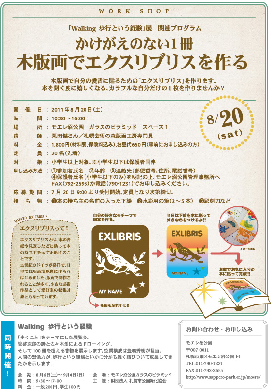 モエレ沼公園のワークショップ 2011年8月18日 モエレ沼公園で8月20日に開催されるワークショップのご案内です。 「木版画でエクスリブリスをつくる」は、素朴であたたかみのある木版画で、愛書に貼るための書票をつくるワークショップです。 図案を一から考えるのが不安という方も大丈夫。簡単にできる図案や、彫刻刀もご用意しております。 子どもから大人まで楽しめる内容で、夏休みの宿題にもぴったりです。 この機会に、とっておきの1枚を作ってみてはいかがでしょうか。 ————– モエレ沼公園管理事務所(電話:011-790-1231) 詳しくはこちら↓