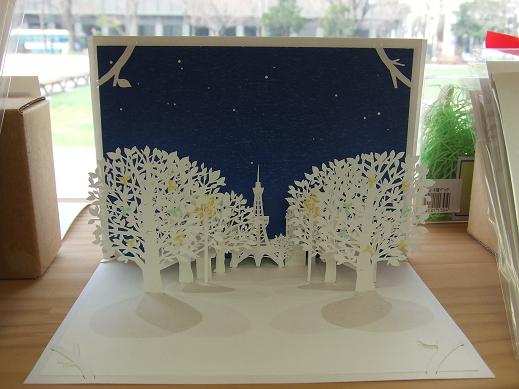 グリーティングカード 2011年4月29日 好評をいただいている、飛び出す立体のグリーティングカードに新しく「テレビ塔と大通公園」が入荷しました。 テレビ塔とライトアップされた樹木が夜空に包まれた幻想的なカードです。