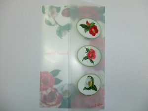 new ボタニカルアート ミニファイル 2010年12月7日 安藤牧子さんの新しいミニクリアファイル『ツバキ』が届きました。書類や通帳、のし袋がシワにならずに収納できます。 (サイズ13.5cm×21.5cm) ※ 他にもサクラ、ライラックなど7種類のファイルを置いています。 〈おもて〉 〈うら〉