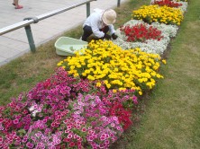 オリンピックの花壇 2012年8月2日 西3丁目西側と西4丁目東側のボーダー花壇(細長い花壇)のデザインが新しくなりました。 なでしこジャパンに金メダルを取って欲しい願いから、大通公園花壇維持ボランティアのみなさんが、 冬の間にデザインしました。 手前が今見頃のナデシコ、その奥が金メダルをイメージしたマリーゴールド、そのまた奥がアリッサムとペチュニアで作られた国旗と、色鮮やかにデザインされています。